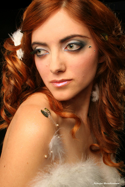 Très joli portrait. J'aime le cadrage (j'aurai même coupé encore un peu en haut pour dynamiser encore plus ce regard). Belle lumière. Bravo pour la coiffure le maquillage et le stylisme. Beaucoup de détails sur la peau (perles, strass)du coup devant tant d'attentions, sans aller jusqu'au lissage, j'aurai bien poussé davantage la retouche cosmeto...