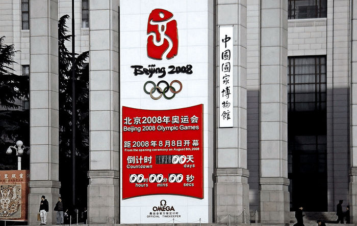 J'aime bien ce contraste "JO new genération" aux couleurs vivves et démesurement grand dans l'elan d'un batiment monochrome et à conté de l'inscription administrative détachée du contexte. Encore une belle "façade chinoise" ;-)