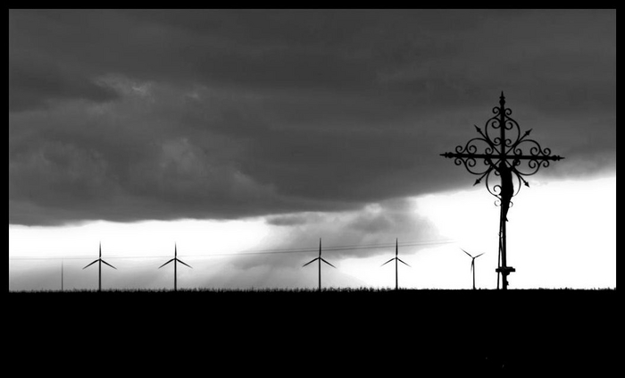 Et symbolique aussi sans doute le rapprochement entre le Christ et l'ultra technicité des éoliennes.
