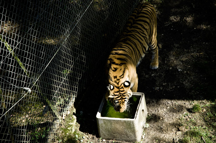 essayer de capter le regard de l'animal peut-être, descendre à son niveau - mais trop près, et en restant bien derrière le grillage