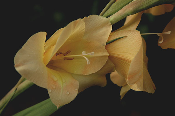Très jolis lys en robe perlée. J'aime ce cadrage en diagonale qui nous mène d'une étamine à l'autre. Peut-être un léger + en saturation!