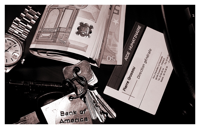 Tout y est : la rolex, l'argent, Pierre Grossou, la Bank of America avec la clé du coffre. Très très chouette cette compo. La seule chose que je n'identifie pas est la pièce de droite, avec le "2" dessus.