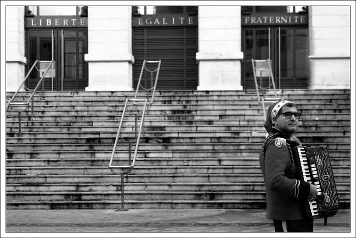 L'uniforme de l'accordéonniste est-il bleu et blanc. Si c'est le cas j'aurais bien vu cette photo en couleur. Sinon la compo est trés sympa.
