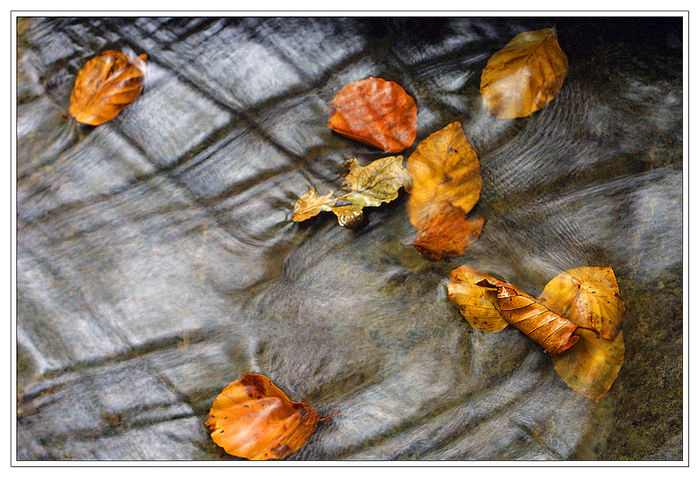 Belles couleurs des feuilles, et bonne idée. Un peu surex l'eau, qui perd toute matière, et la feuille du bas à décoller amha du cadre. Amts.