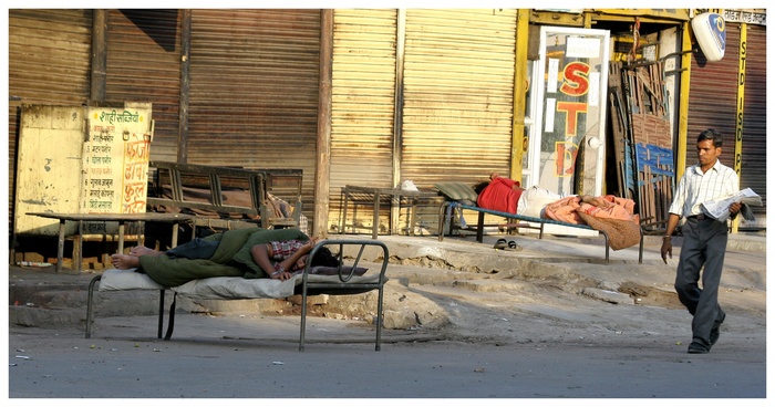 un homme sans chaussure dort dans la rue dans l'ombre, et de l'autre côté un homme dans la lumière en chemise blanche marche (avec chaussure) tout en distribuant ses journaux.