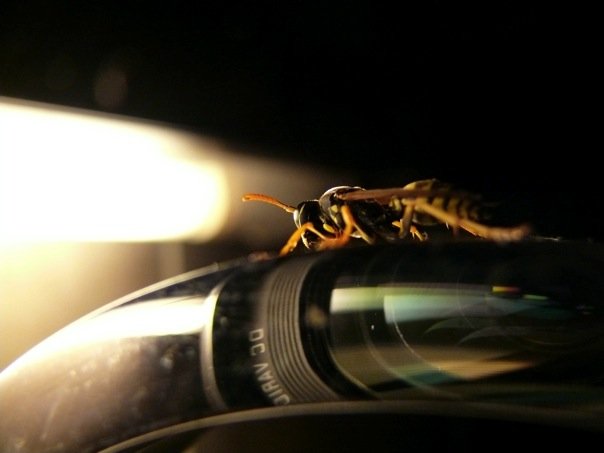 La lumière blanche attire l'oeil et le truc sous l'insecte... ben on voit pas ce que c'est, on devine le reflet de l'objectif, ce qui est déroutant...
