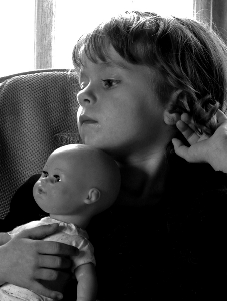 Un contre jour maitrisé, mais ça manque quand-même un peu de lumière sur cette jolie petite fille. J'aime bien le naturel dans cette photo; le regard de côté, elle semble perdue dans ses rêves d'enfances, la poupée à la main.