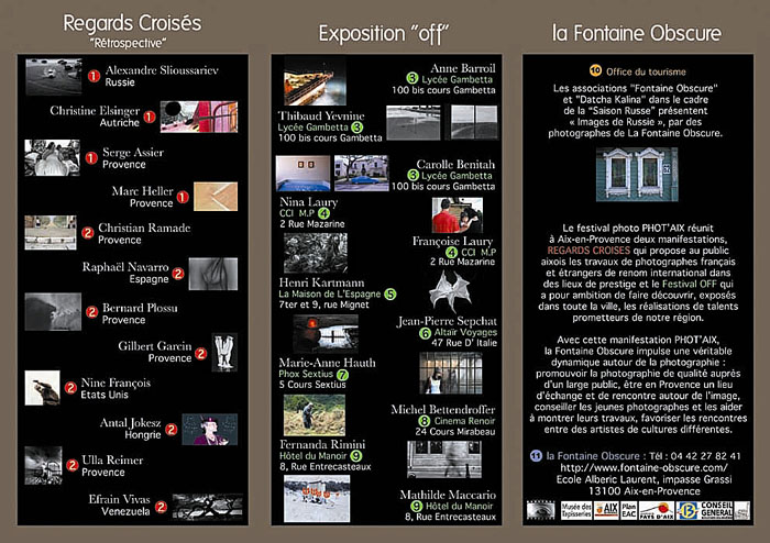 Vous êtes cordialement invités au vernissage le mardi 14 octobre à 17 h 30, chez Altaïr Voyages, 47 rue d'Italie à Aix, ou demain, vernissage du festival "In" !