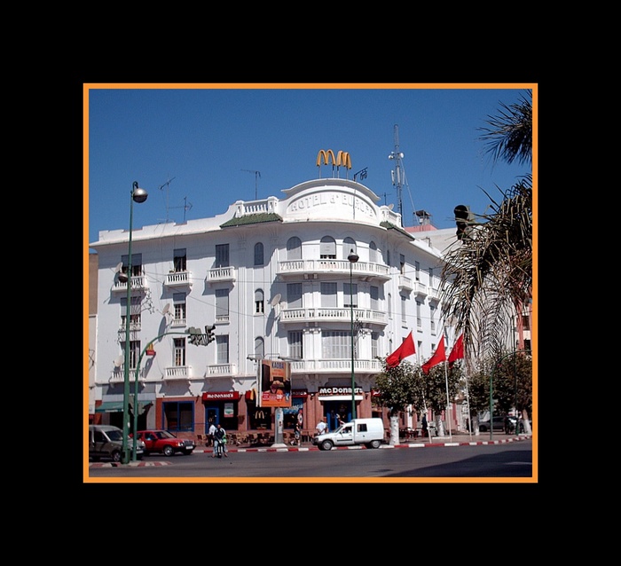 Bâtiment datant de la présence française, enseigne hautement américaine......drapeaux marocains.......J'avoue que peut être la lecture n'est pas facile. Désolée