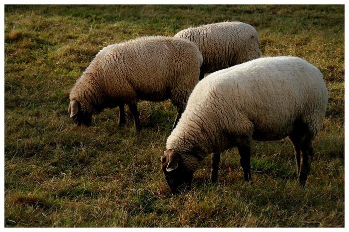 Tout le monde à table! dommage qu'il n'y ait pas assez d'espace entre les moutons, surtout celui du fond trop entassé sur les 2 autres. Les noirs me semblent un peu bouchés, on ne distingue pas trop les détails des têtes.