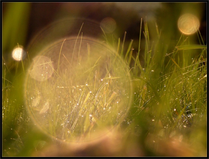 j'aime bien les deux gouttes principales sur la diagonale, la luminosité de l'herbe à travers les gouttes, les anneaux de Newton qui décore les gouttes,