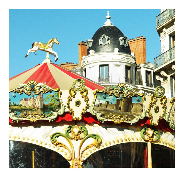 Très en couleurs, j'aime bien ces manèges anciens. Bien vu les "dômes", celui du manège et du bâtiment derrière. Sauf si cela vient de mon écran, je trouve que c'est un peu trop lumineux.