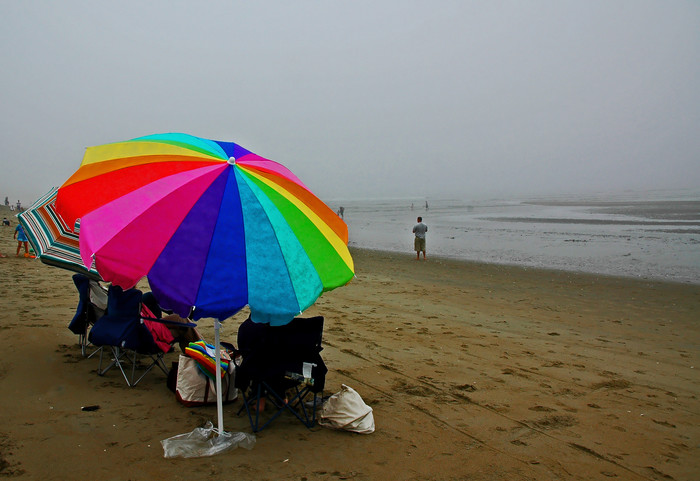 J'aime bien l'original notamment le contraste entre les couleurs du parasol et la grisaille ambiante. Il y a des irréductibles partout....