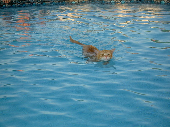 C'est vrai que c'est assez rare de voir un chat nager ! Mais la photo est floue et le chat est trop centré. De plus on voit le bord du bassin et une main en haut du cadre.