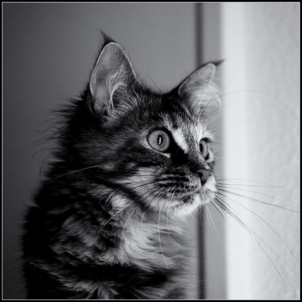 vraiment adorable ! J'aime bcp le N&B même si je trouve la bande blanche verticale un peu surex et le reflet dans son oeil droit un peu trop prononcé ! malgrés ca, la photo est agréable à regarder, et il est difficil de resister à une bouille pareil de tte manière ...