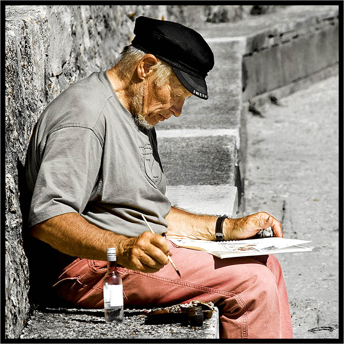 Très beau ce portrait. J'aime l'attitude concentrée de cet homme avec son carnet de dessin. Et un traitement d'image super bien réalisé. Bravo