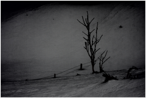 Un traitement gris qui lui va bien puisqu'il lui donne un air "lugubre" à cet hiver. Quelque chose passe dans ta photo.