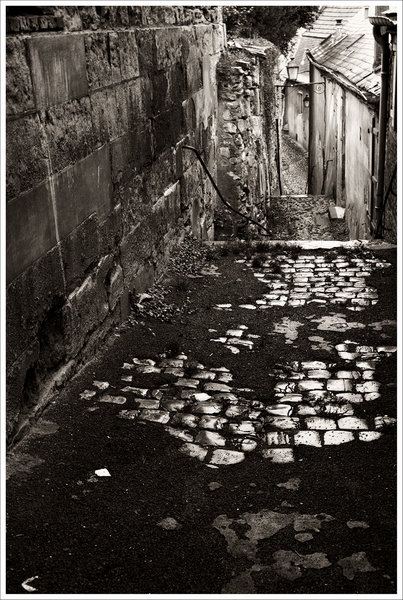J'aime beaucoup ce cadrage qui réserve les trois-quarts de l'espace aux pavés après la pluie, chemin qui disparaît ensuite dans le dernier quart, et cette perspective à hauteur de mur qui dévoile un patchwork de pierres haut en contraste!