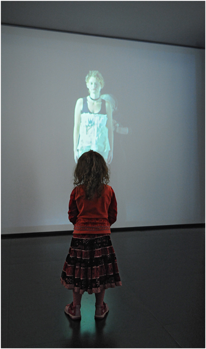 image prise sur le vif, dans une galerie, ou il projetait un film sur la couture.
