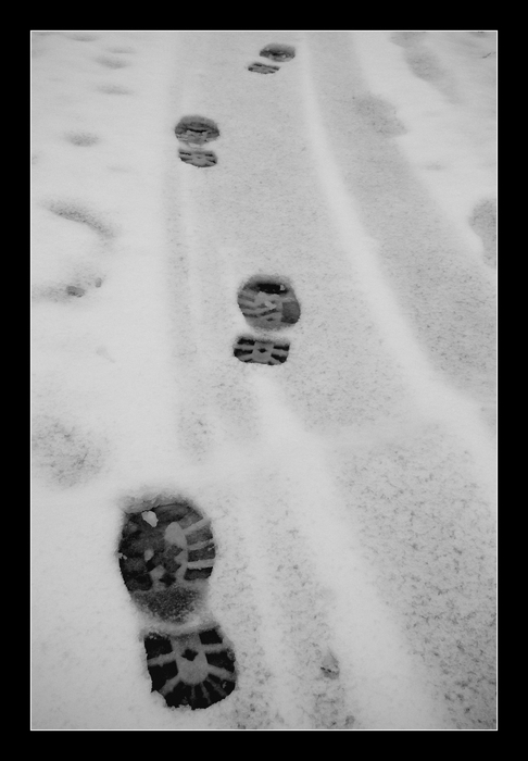 Une très bonne idée, un traitement réussi Une promenade cependant un peu limitée, car pour moi 4 traces de pas ne représentent pas suffisamment l'idée de randonnée. La même, mais avec un point de vue plus "ras du sol", avec une perspective des pas, et tout bon ! Amitiés.