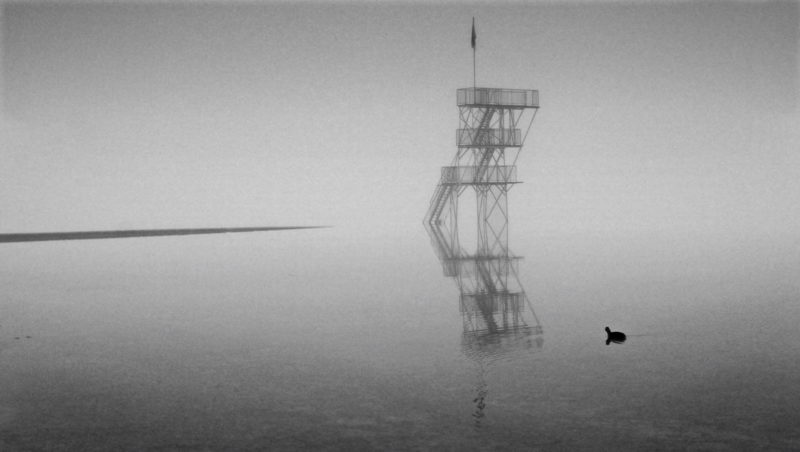 Super N et B...le grain évoque bien le brouillard (ou l'inverse).les tons gris sont bien adaptés au brouillard. J'aurai peut-être placé le plongeoir sur un point fort de l'image...mais belle ambiance