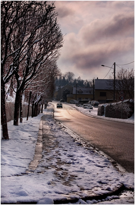 La lecture de cette photo est simple et efficace, grâce à ce cadrage bien pensé : l'arrondi du trottoir, qui nous mène à la route, qui entre dans le village. Belle lumière, bon traitement du ciel. La voiture apporte incontestablement un plus, mais roulait-elle à 30km/h?? Belle photo.