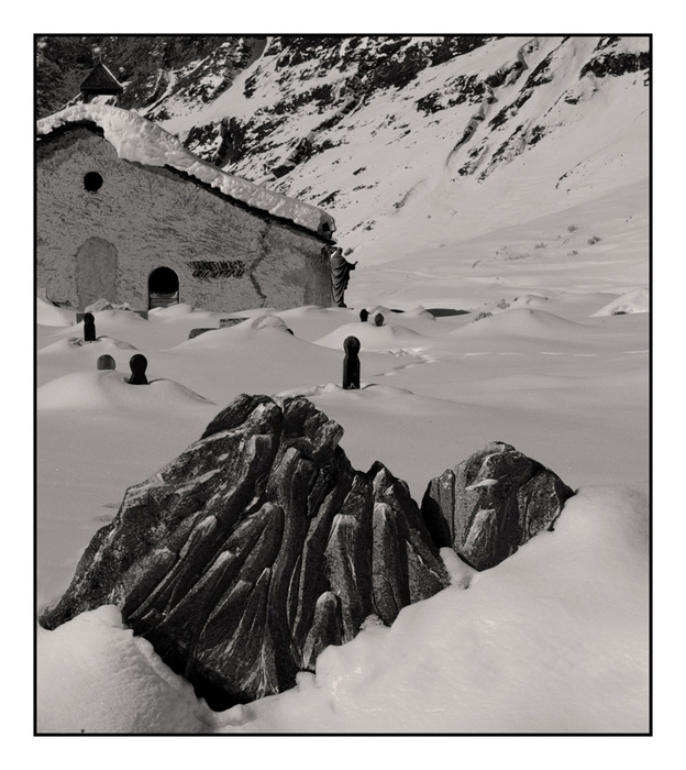 Pas du tout d'accord avec Mino pour dire que le rocher fait à lui seul la photo.. Le modelé de la neige, les "têtons" des tombes qui dépassent, la statue devant la montagne donnent à mon sens, le message.. Le rocher du 1er plan, moi vu comme il est traité, j'y vois des "âmes", des "silhouettes" qui guident dans la photo..