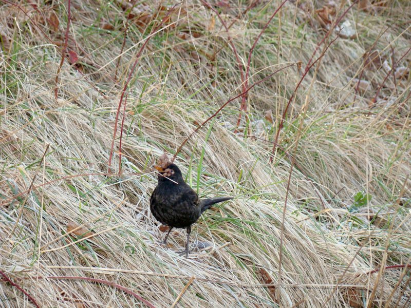 Toute blague mise à part, l'oiseau est un peu perdu dans ce grand cadrage ouvert. Et du fait que la mise au point ne soit pas vraiment dessus, on a du mal à voir qu'il tient effectivement un brin d'herbe dans le bec. Ca aurait pu être une herbe d'avant plan un peu floue.