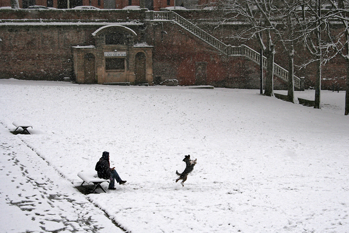 Le décor est très bien choisi et tu fais la part belle à cette cour enneigée et à cette scène rigolote prise sur le vif, ça me parle! J'apprécie particulièrement la sobriété de ce premier plan, et l'atmosphère ouateuse et enivrante un peu (en tout cas pour le poilu), premier plan que certains diraient trop présent ou trop vide, pas pour moi.