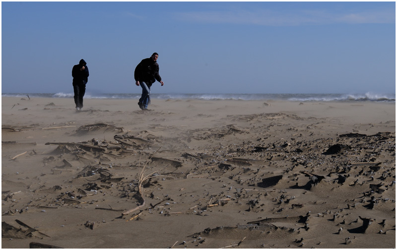 J'aime bien quand l'image est prise au ras du sol, ici on sent complètement le vent et le sable voler, la vague au fond avec les embruns..