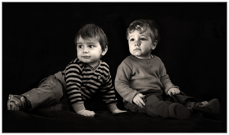 Superbe noir et blanc, lumière très bien gérée, peut-être un tout petit peu trop forte sur le côté gauche de l'enfant de droite (quand on regarde la photo). J'aurais bien vu les mains de l'enfant de gauche en entier, surtout sa main gauche, et son pied aussi. Du chipotage car c'est un très bon double portrait!