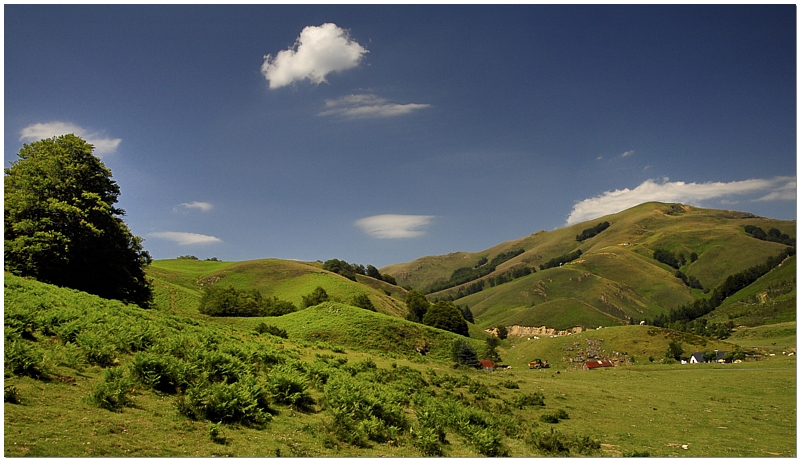 Très beau paysage aux couleurs sympathiques, un beau vert (même plusieurs verts), un ciel bleu parcellé de quelques nuages blancs. J'admire ce coin magnifique et reposant. Un petit regret, le nuage à gauche : je l'aurais mieux vu "détaché" de l'arbre.