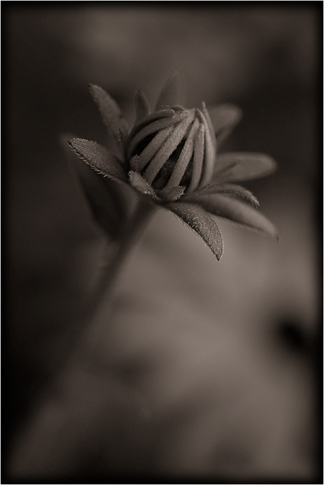 Original ce bouton cendré, avec un traitement pareil, les intentions de l'auteur sont au moins explicites. Le pétale de l'arrière plan gauche chevauche celui qui est net pourquoi pas un placement du bouton vers le bas pour les "retombées"?