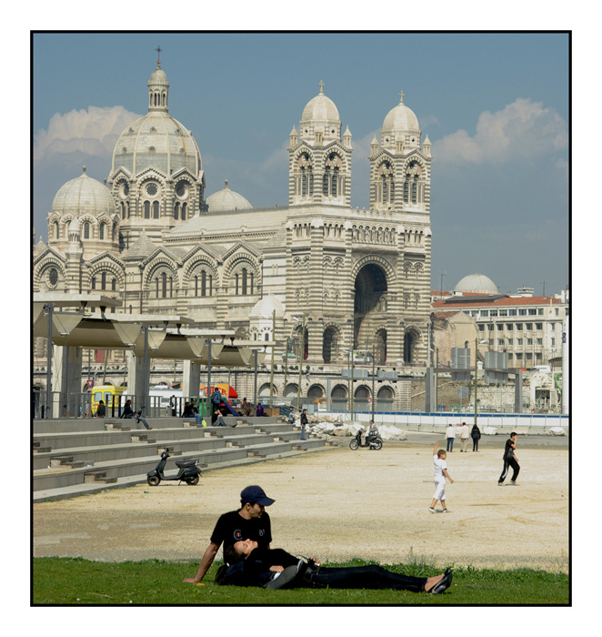 lumière bien gérée pour un soleil au zénith, la compo est vivante avec un ensemble de couleurs. ils ont posés le scooter et profite du soleil.