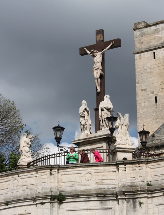 sur la photo j'aime bien ce contraste entre le ciel très gris et les couleurs flashy des pulls des dames, et la croix se détache bien avec ce ciel sombre. Un recadrage serait peut être utile sur les cotés ou en bas.