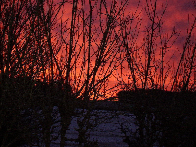 Le contraste neige/ciel "en feu" était interessant et bien vu, mais je trouve le bas de la photo trop sombre. Le ciel, caché par un peu trop de branches, est magnifique.