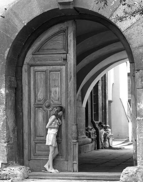 T'es un vilain Dali, le bord de la porte en bois est à 252 pixels dans sa partie haute et à 252 pixels au bas au dessus de la parte sculptée. Le mur blanc au fond est aussi vertical. C'est pas la faute de earendil si les maçons de l'époque étaient fachés avec le fil à plomb, car effectivement les deux bords du portail penchent un petit peu surtout le bord de gauche, mais comme ils sont pas droits ...