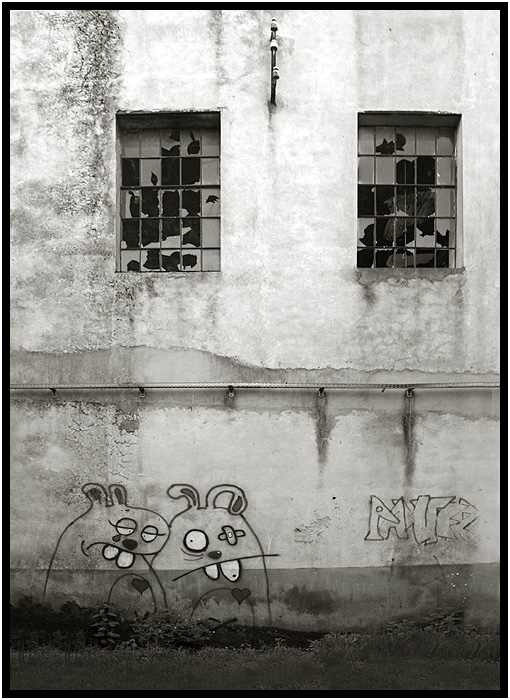 J'aime bien ! Je la trouve équilibrée cette photo, tant dans la compo que dans le NB de la façade (mais juste pour moi, l'herbe a un gris qui me fait bizarre devant, comme trop claire
