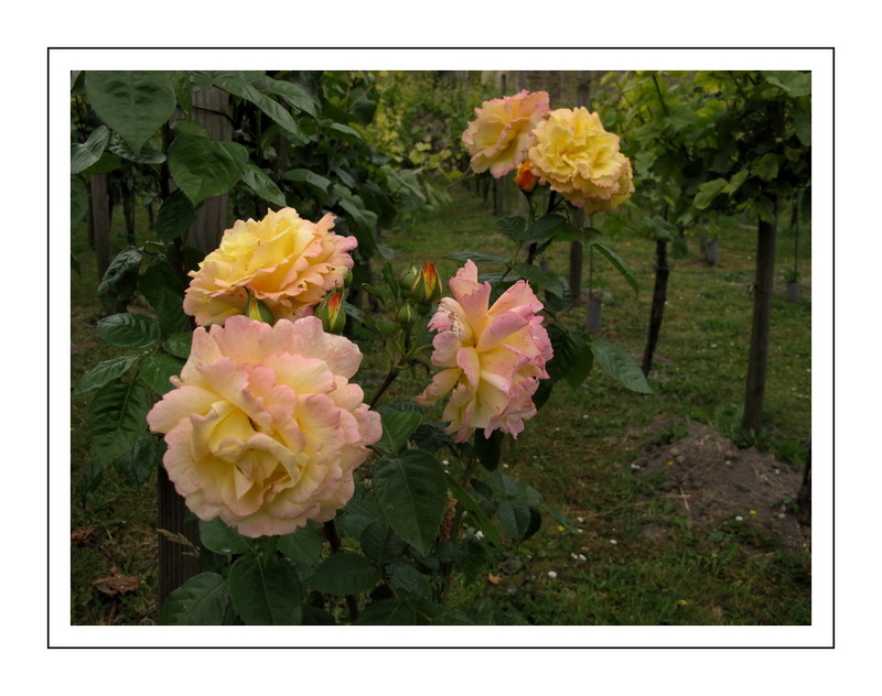 De jolies couleurs et une compo équilibrée. par ici également il y a des rosiers en début de rangée. c'est esthétique et je crois qu'il y a un raison phytosanitaire (pucerons, Oïdium...)