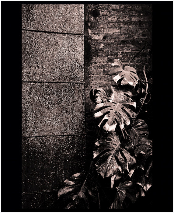 Belle opposition de 3 textures: mur, brique et végétal.