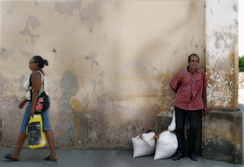 Jolie photo avec ce contraste femme en mouvement / homme immobile. La femme est peut être juste un peu trop bord cadre (du coup mon attention est principalement attirée sur l'homme aux sacs), pour le reste j'aime bien.