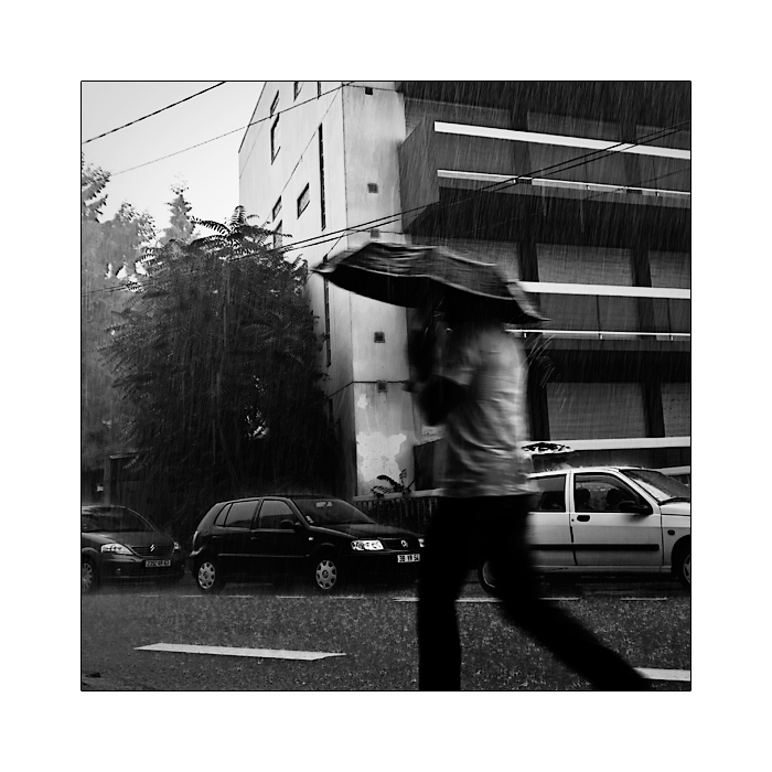 Sinon, le mouvement de la passante, l'environnement, le rendu de la pluie et le NB
