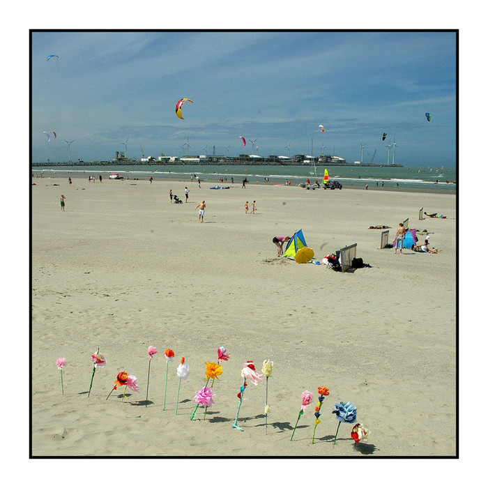 Plus que les fleurs, je vois le vent sur cette tof : les éoliennes, les abris de plage, les cerfs volants, les planches à voiles.