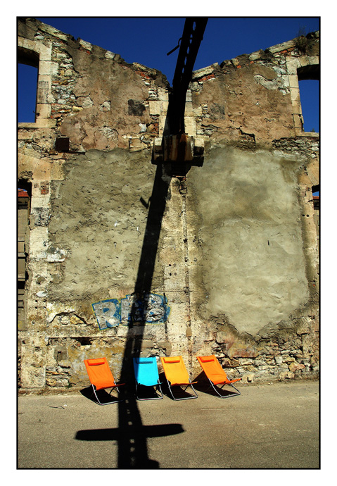 Sujet sympa et bonne compo ! Dommage que l'ombre morde les chaises longues, en les déplaçant un peu l'effet aurait été meilleur je pense...