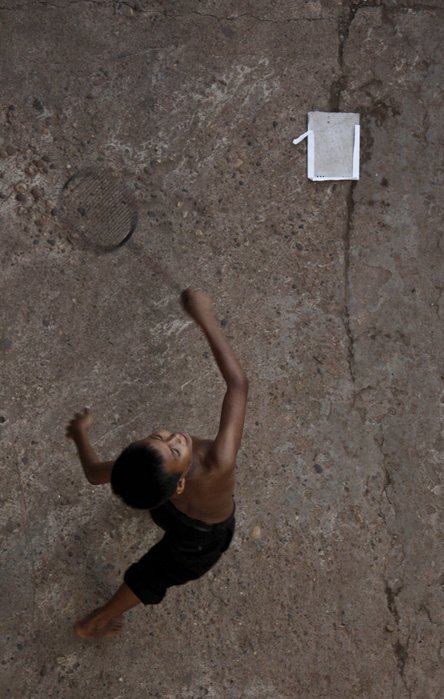 Prise au hasard d'une rue, au Laos, un enfant qui joue au badminton...