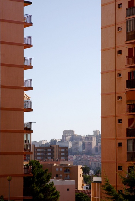 Les deux immeubles qui se répondent et l'absence de personnages suggèrent l'enfermement et la solitude du "chacun chez soi".