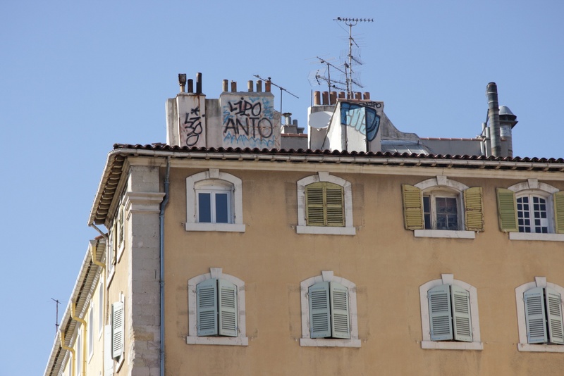 Aucun message de ma part (comme d'ailleurs pour la quasi totalité de mes photos). J'ai seulement remarqué (en me promenant) que la cheminée la Plus taggée ne supportait pas d'antenne. Rien qu'un clin d'oeil aux "taggers" audacieux qui n'ont pas hésité à monter sur le toit tout près du Vieux Port, sous les yeux de la Bonne Mère.