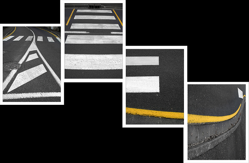 Très beau montage, avec une suite logique pour moi : passage piétons horizontal, puis vertical, la 3e fin du passage piètons vertical et ligne jaune, et finir avec la fuite de la ligne jaune.
