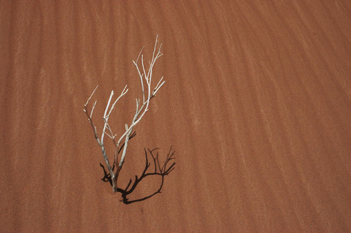 là je succombe ! à la fois le désert que j'adore et une photo sobre et dépouillée comme j'aime.......que dire ? j'aime l'ombre de ce maigre buisson sur le sable, on pourrait renforcer un peu les contrastes sur les rides du sable, mais pour moi elle est parfaite comme ça !