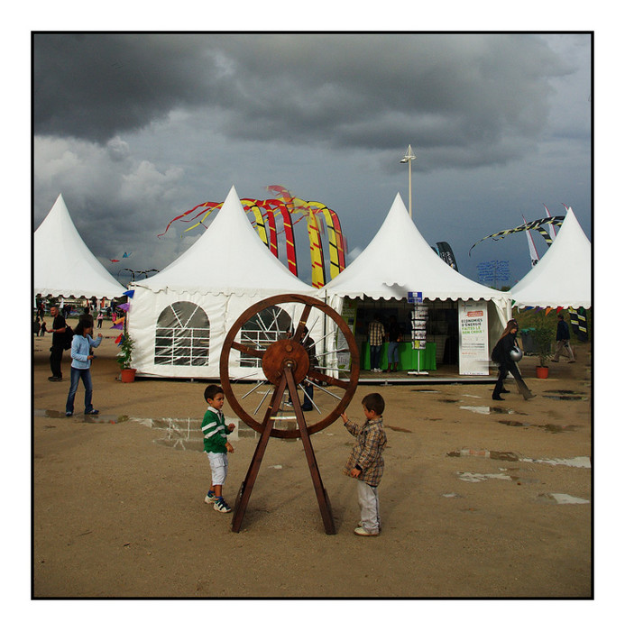 L'ambiance est assez sympa, mais si la roue est le sujet, je trouve l'arrière plan trop présent. Le ciel est beau, mais à mon avis entre le ciel, les tentes, et les enfants et leur roue, on a du mal à savoir quoi regarder.